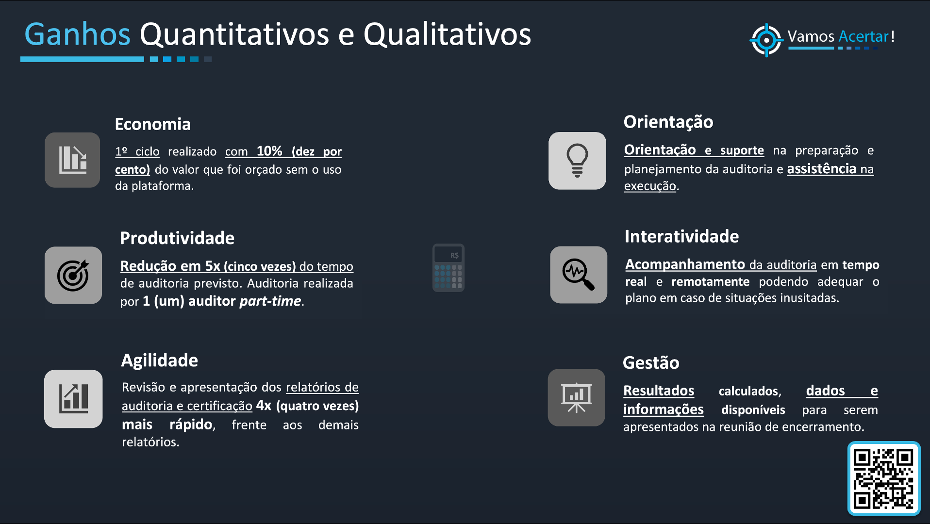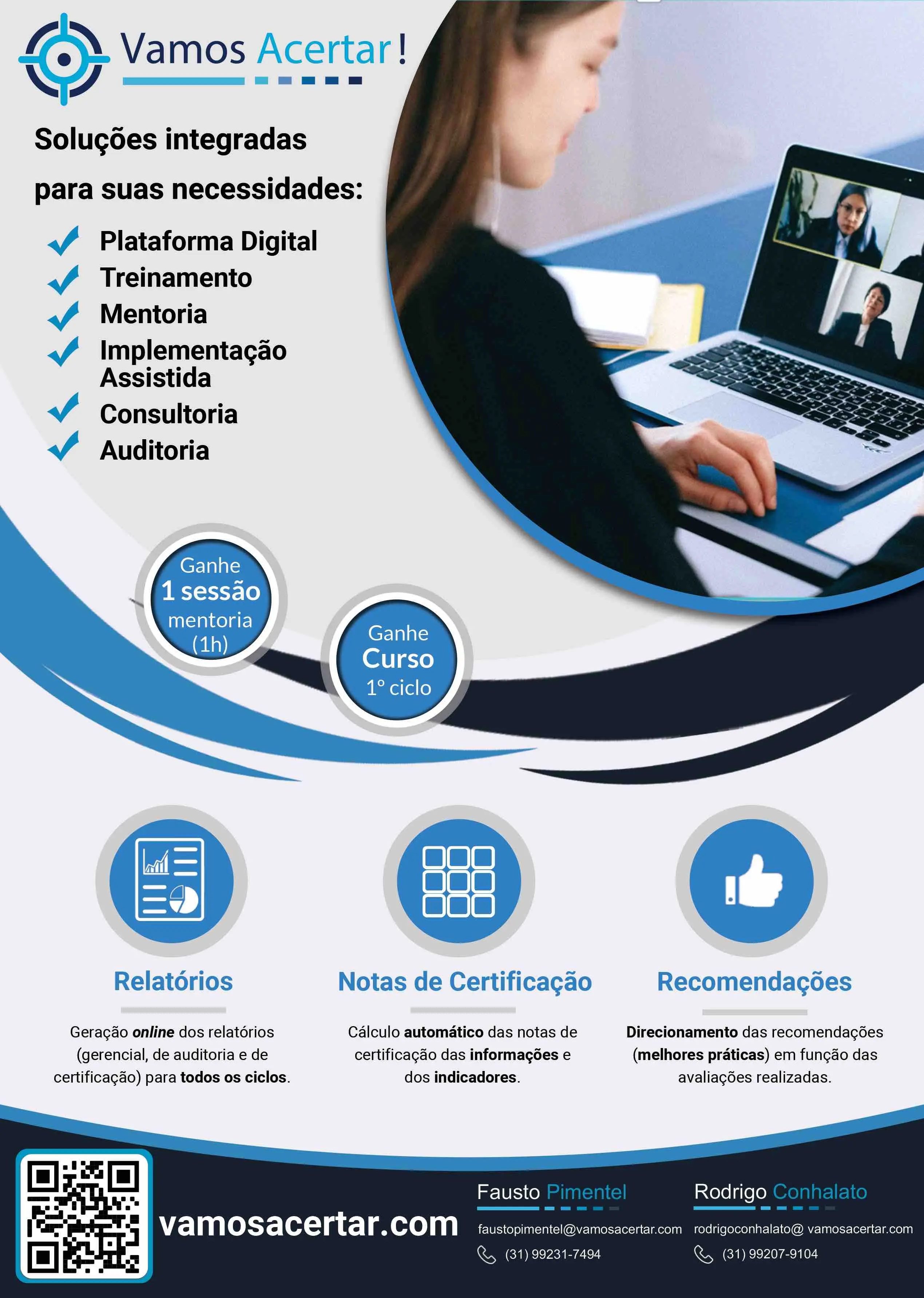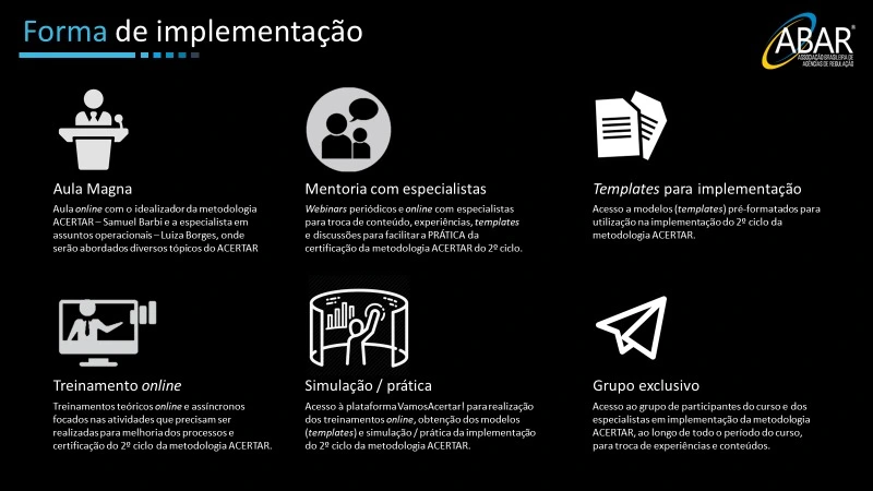Capacitações na metodologia ACERTAR, uso da plataforma online, realização das autoavaliações / auditorias, formação de auditores, entre outras.